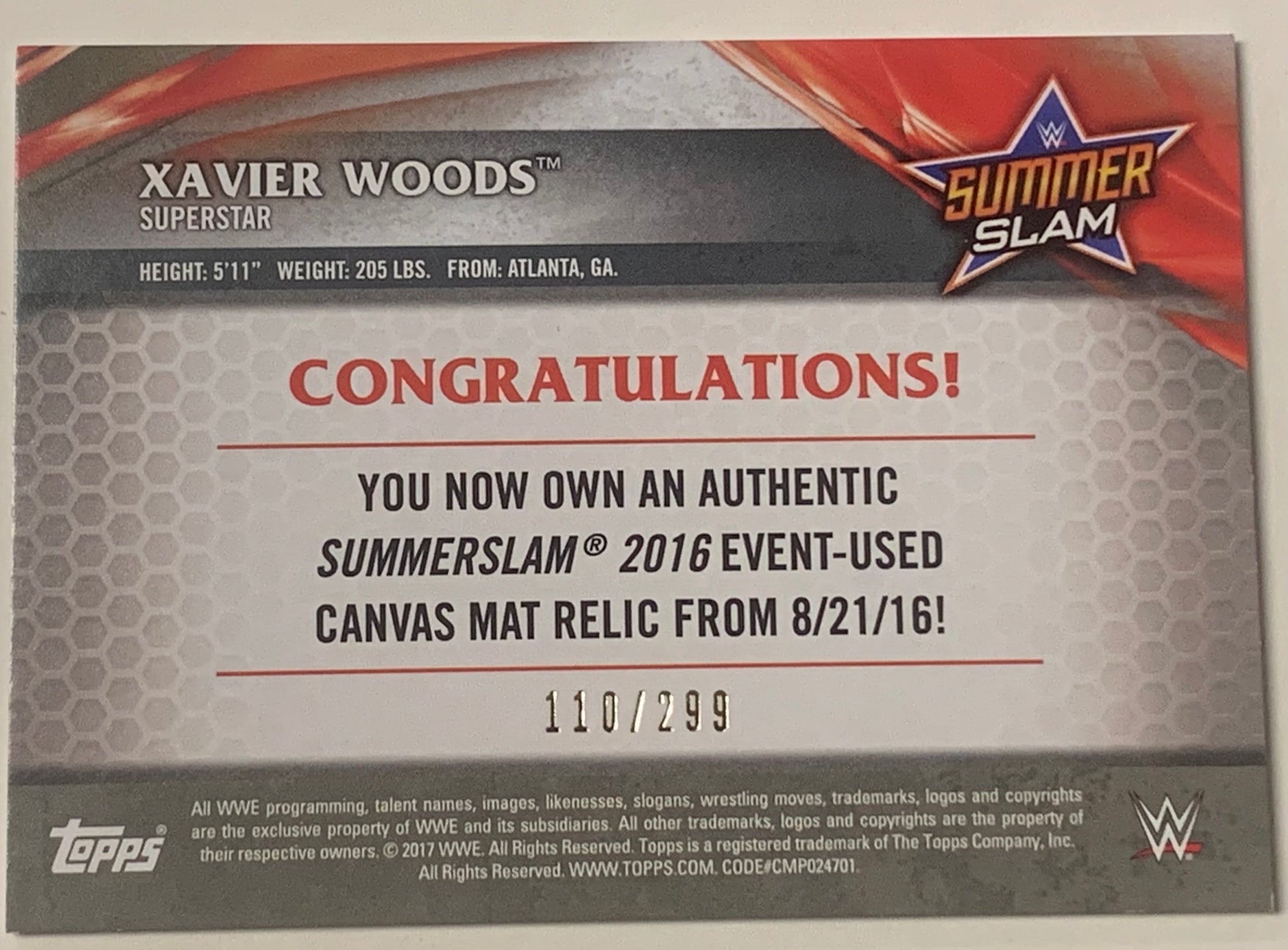 Xavier Woods 2017 WWE Topps “Summer Slam 2016 Event-Used Canvas Mat Relic” Card #110/299 (Only 299 Made)!!!