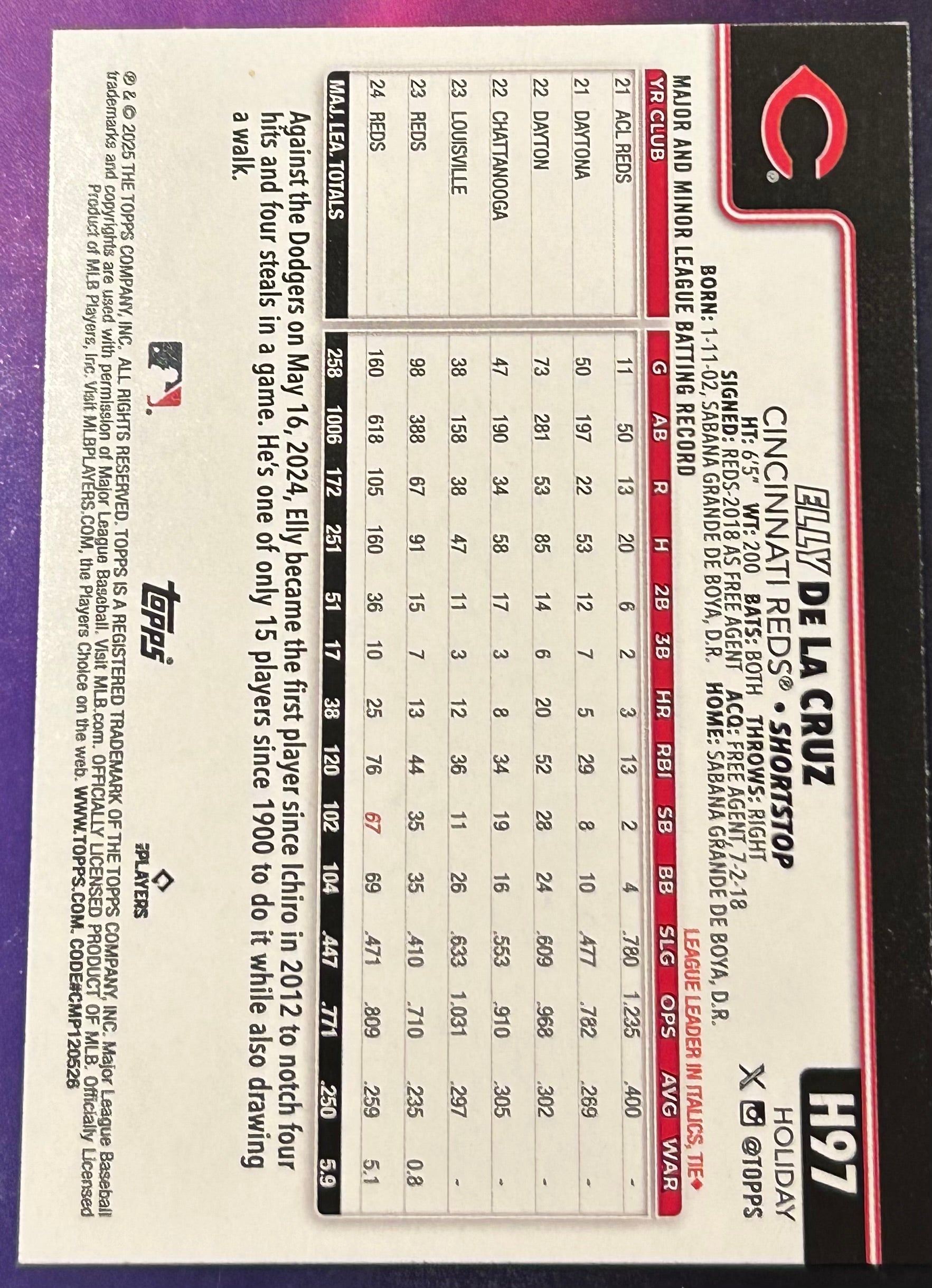 * Elly De La Cruz 2025 Topps Holiday Variation Card (Cincinnati Reds)