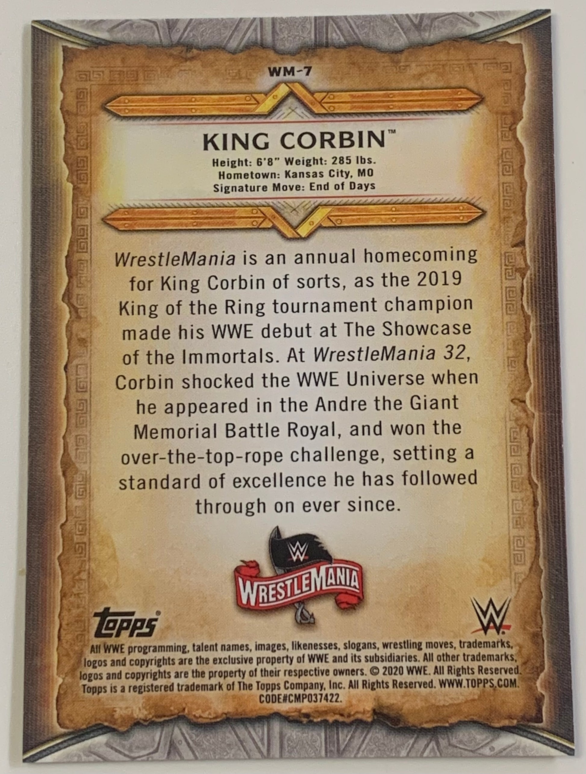 King Corbin 2020 WWE Topps Wrestlemania Insert Card #WM-7