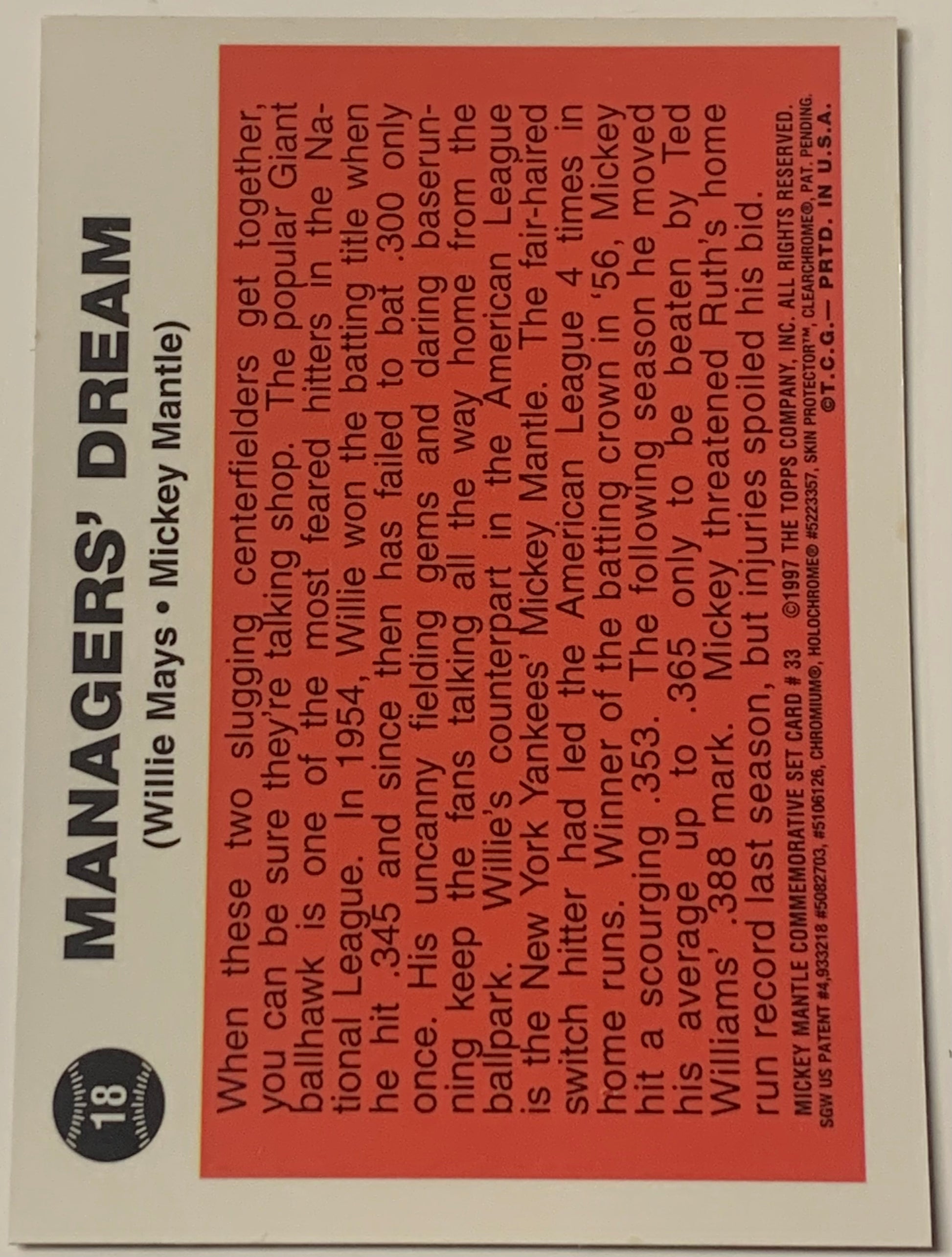 Mickey Mantle & Willie Mays 1997 Topps Chrome Commemorative Card (H.O.F. Legends)