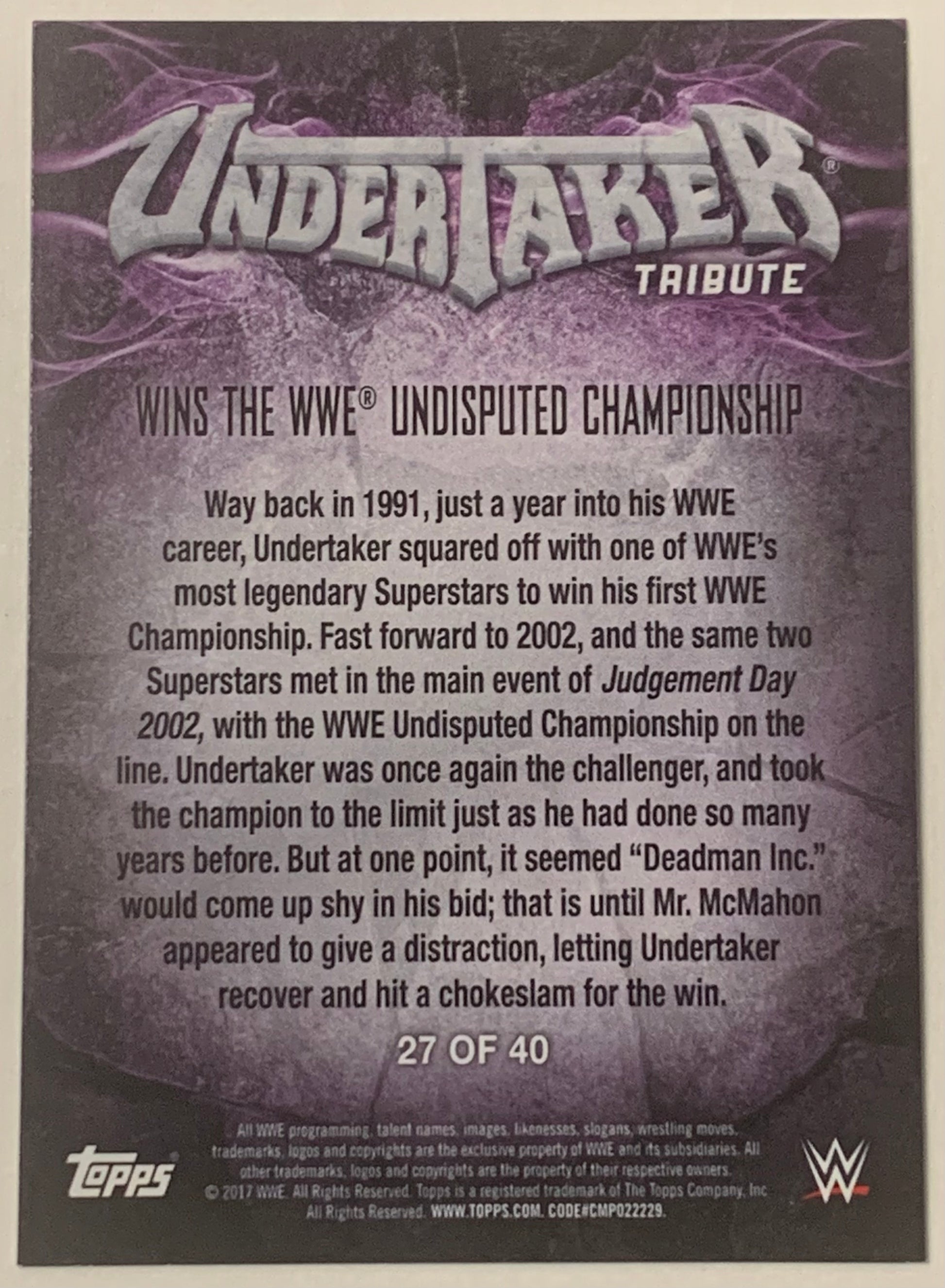 Undertaker 2017 WWE Topps “Undertaker Tribute” Insert Card #27 of 40